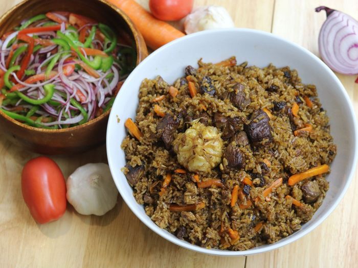 Pilaf rice is often served with a side of pickled vegetables or sour cucumbers to balance the dish's richness. This popular and enticing meal is a must-try for visitors traveling to Xinjiang.