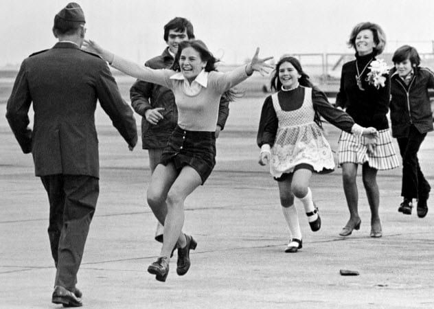 Slava “Sal” Veder, an Associated Press photographer, documented the emotional return of Lieutenant Colonel Robert L. Stirm at Travis Air Force Base in California. Stirm, a prisoner of war held by the North Vietnamese for over five years, was met on the tarmac by his 15-year-old daughter (center) and his family. The image perfectly encapsulates the overwhelming joy as his daughter sprinted toward the father she hadn’t seen in years.