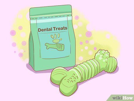 Offer your dog dental-cleaning treats to help loosen plaque and tartar. You can choose products like raw hides, chew sticks, bones, or dental-cleaning biscuits. Check the label to ensure the product is the right size for your dog. Give your dog one piece daily, and always supervise them while they chew.