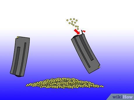 Fill the magazine with BBs. Open the trap door, usually located at the top of the magazine, and carefully pour high-quality BBs inside. Be mindful not to overfill, as this could cause a jam. Close the trap door securely when done.