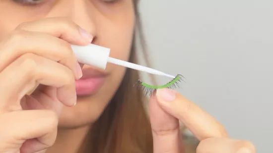 Apply lash glue along the outer edge of the false lashes using a glue applicator or small brush. Wait for the glue to become tacky before attaching the lashes to your eyelid.