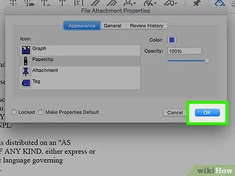 Customize the display of the attached file. Simply use the dialog box to adjust the color and visibility of the icon representing the attached file within the PDF document.