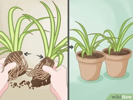 Divide larger plants for propagation. Separate overgrown spider plants by cutting or gently pulling apart the root ball into smaller sections, each with a few leaves. Replant these sections in fresh potting mix. Alternatively, you can place the plantlets with roots in a glass of water.