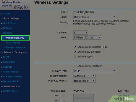 Click on Wireless Security (Wireless Network Security). This option is located below the Wireless menu on the left side of the page.