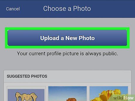 Chọn một ảnh hoặc nhấn Upload a New Photo (Tải ảnh mới). Nếu không thể xem ảnh bạn muốn sử dụng trong mục Ảnh được đề xuất, nhấn Tải ảnh lên (Upload a New Photo) để mở thư viện ảnh trên Android. Nhấn vào ảnh bạn muốn thêm vào Facebook.