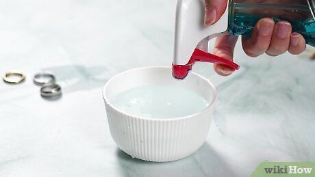 Fill a small bowl with warm water and a dash of dish soap. Edward Lewand, a graduate gemologist and accredited appraiser, recommends using a mixture of warm water and Dawn dish soap as a gentle yet effective solution for cleaning most materials, including gold, platinum, and diamonds. Start by adding a small amount of dish soap to warm tap water in a bowl, then stir it together.