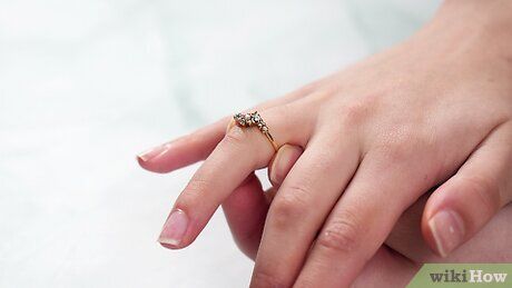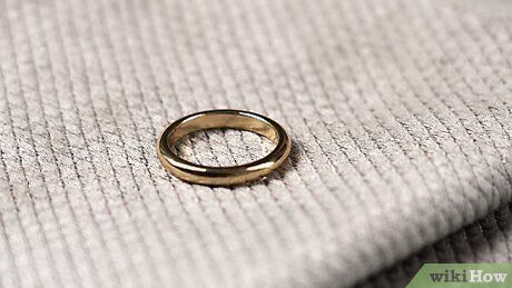 Remove your ring while exercising. Wedding and engagement rings are delicate, and the impact from weights or workout equipment can cause scratches or bends. Additionally, the sweat and oils from your skin during exercise can dirty your ring. To maintain its shine and condition, it’s best to take it off and store it in a safe place while working out.