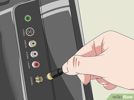 Locate the coaxial ports on both your TV and VHS player. The coaxial port is a round metal cylinder with a small hole in the center, though older TVs might have a small round hole at the back.
