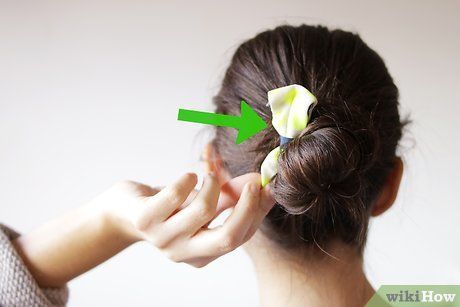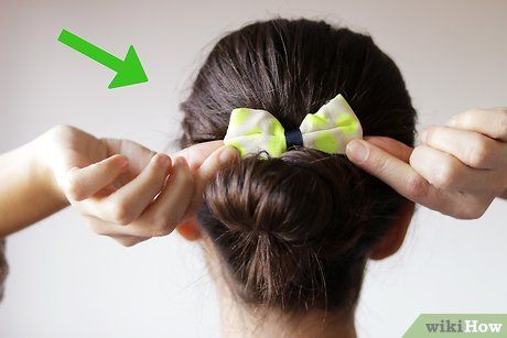Create the messy bun. Now, repeatedly wrap the hair around itself to form a large coil, leaving the tail at the bottom. Wrap the tail around the bun to conceal the hair tie. Secure the tail with 2-3 bobby pins. Then, gently pull the bun apart in the middle, spreading it to both sides, and secure it with bobby pins.