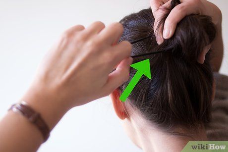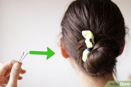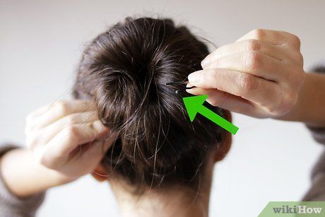 - Insert the pins underneath the bun so only a small part is visible. Pin them below (not above or around) the hair tie and focus on securing the center of the bun.