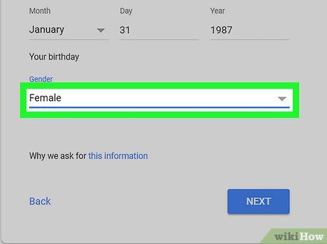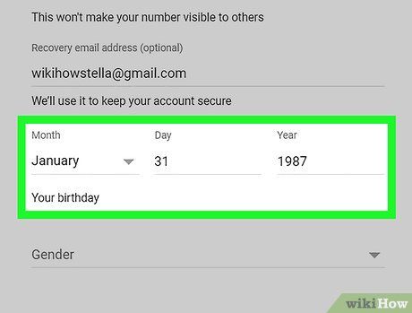 Provide your birthdate and gender. Select your birth month, followed by the day and year of your birth. Then, choose your gender from the options in the Gender field.