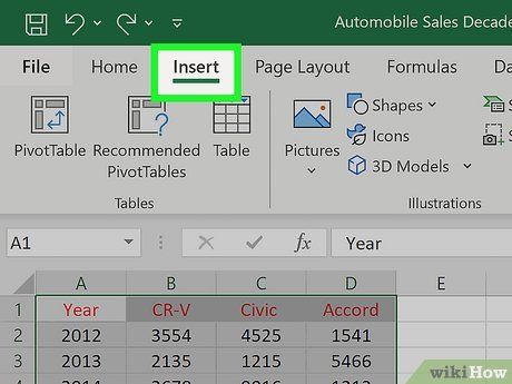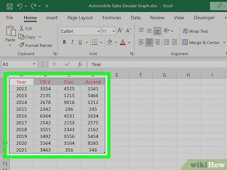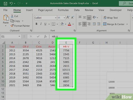 - For example, if you want to create a chart showing Honda car sales over the past 10 years, column A should be labeled "Year," and columns B, C, and D should be labeled "CR-V," "Civic," "Accord," etc. The lines on the chart will be named CR-V, Civic, and Accord, based on the years entered in column A.