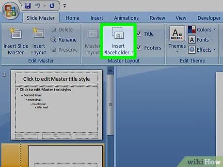 Click on the Insert Placeholder button. This option is located to the left of the Slide Master tab. A dropdown menu will appear with the following options: