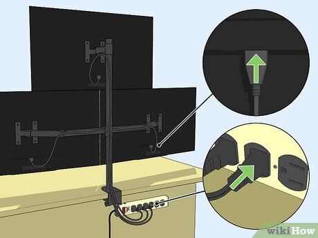 Connect the power cables for your monitors and plug them in. Ensure that all power cables can easily reach an electrical outlet. Be aware that some monitors come with very short power cables, which could make plugging them in difficult when setting up a stacked configuration.