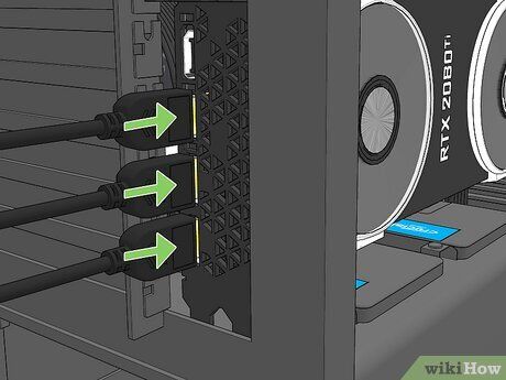 Connect each display cable to your GPU. Be sure to plug the cables into the ports on your graphics card, not the motherboard. If your motherboard has integrated graphics, you can connect one monitor to the HDMI port on the motherboard. For the best picture quality, it’s advisable to connect your primary monitor to the dedicated graphics card. Gamers might experience dropped frames if their secondary monitor is plugged into the motherboard.