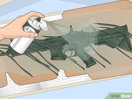 Place your gun back on the cardboard box and prepare your paints and other tools nearby. Grab your lightest color (for example, tan), and hold the spray can at a slight downward angle, about 8 inches (20.3 cm) away from the gun. Lightly mist your gun with the paint. Never get any closer than this. The coating should be light, and there may be areas that remain untouched by the paint. If that happens, DO NOT continue spraying the same spot or move the can closer. Just apply a very light coat for now—you can always go back to fill in later. Make sure to cover all areas you want painted, even if other colors will be added on top. Depending on the temperature, you’ll want to let the paint dry for anywhere from 20 minutes to 2 hours. If it's a hot, sunny day, carefully take your gun outside (avoid touching any painted parts, even if they look dry) and leave it in the sun for about 20 minutes, along with the box to prevent dust from settling on the paint.