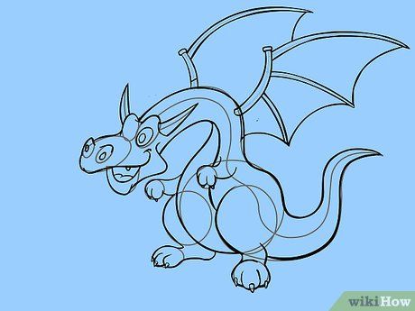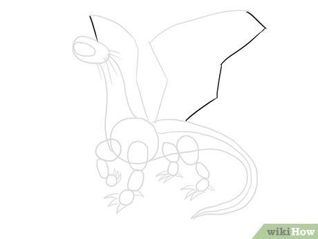 Sketch two curved lines extending from the dragon's neck, then add more curves to create the wings.