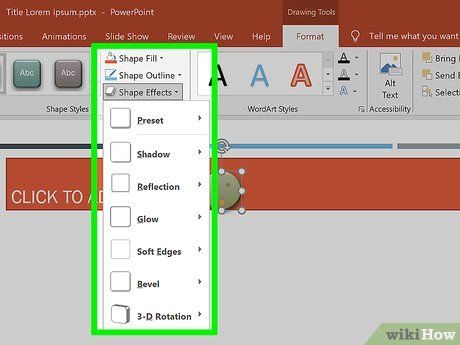 - "Shape Effects" includes pre-set graphic or lighting effects for shapes, such as "Embossed", "Glow", or "Shadow". You can apply multiple effects to a shape at once if desired.
