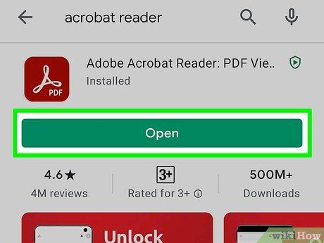 - To install the app, open the Play Store, search for Adobe Acrobat Reader, tap on the app name in the search results (featuring a red icon with a white stylized A), and then tap Install.
