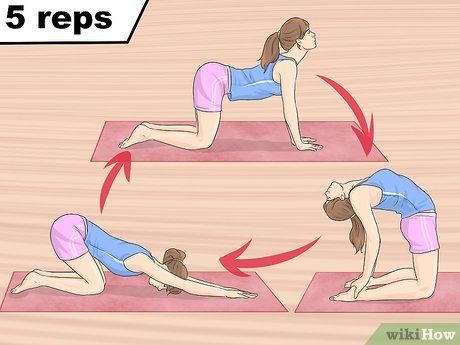 - Move back into the starting position. Inhale as you move. Arch your back upward, tucking your chin and engaging your core. This is the Cat Pose, and you will feel a stretch in your back muscles.