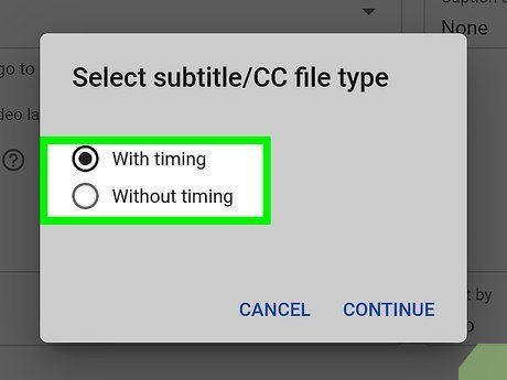 Select "With Timing" and click Continue. Since the SRT file contains timing information for the subtitles, click the circle next to "With Timing," then click Continue at the bottom-right corner of the window.