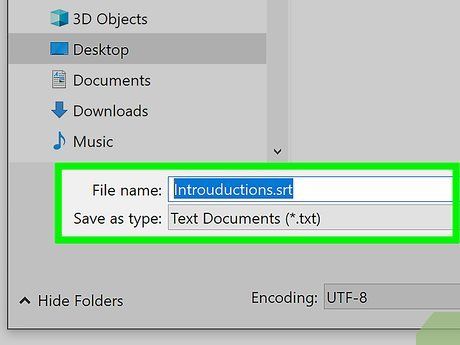 Enter a name for the subtitle file. Use the box next to "Filename" to type a name for the subtitle file. It is recommended to name the file the same as the corresponding video. For example, if the video is named "Introduction.mp4", the SRT file should be named "Introduction.srt".