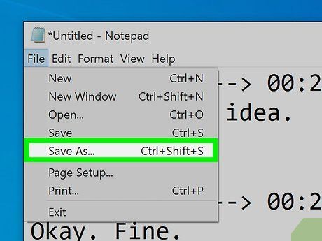 Click on File and then click Save as. After completing the subtitles in your text editor, save the file with a ".srt" extension. The Save option is located in the File menu at the top of the screen.