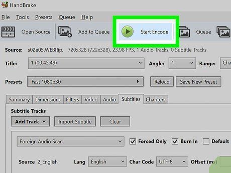 Click on Start Encode. This button is located at the top of Handbrake, next to the green triangular Play icon. This step encodes the video with embedded subtitles. You can enable subtitles in your media player by selecting the subtitle menu and turning them on.