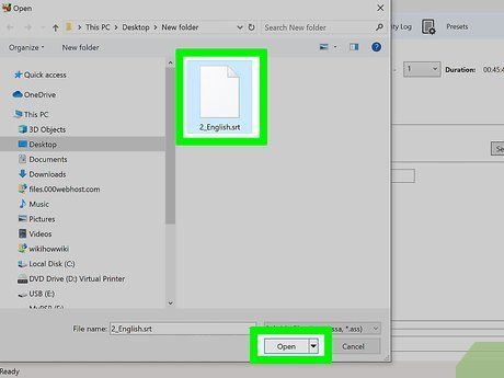 Select the subtitle file and click Open. Use the file browser to locate the SRT file. Click to select it, then click Open to upload the file.