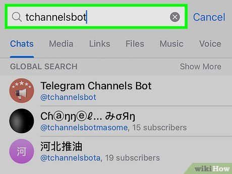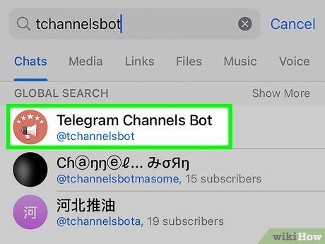 Tap on the result "Telegram Channels Bot". If you entered the correct search term, this will be the only result at the top. It is the channel named "@tchannelsbot" below.