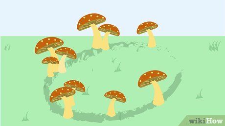 Identify the fairy ring. The fairy ring is a circle of mushrooms that grow in the grass. While they can often be spotted easily, sometimes the mushroom caps are not visible. In such cases, the fairy ring appears as a darker ring of grass. In some situations, it may manifest as a ring of dead grass.