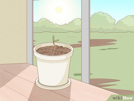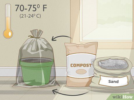 Try germinating the seeds in a pot if you prefer. Prepare a pot for each seed. Fill the pot with equal parts seed-starting soil and sand. Lightly water the soil to keep it moist and place the seed in the soil so that half of it is exposed. Cover the exposed part with sand. Wrap the pot with plastic wrap and place it in a location with indirect sunlight and a temperature of about 20°C.