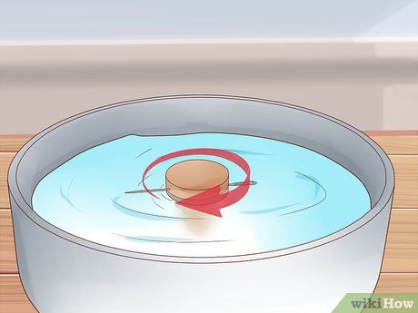 Place the cork disk in the center of the water-filled bowl. The needle will be able to spin freely like a compass needle and will eventually align itself with the Earth's magnetic poles.