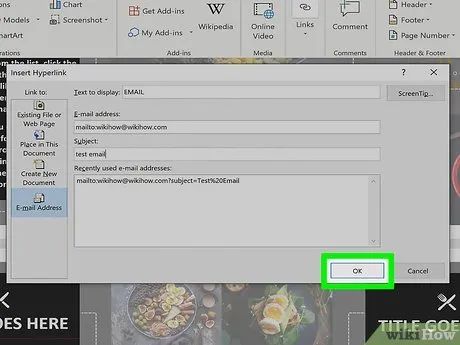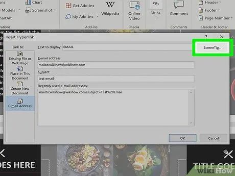 Set up a ScreenTip (Optional). You can customize the text displayed when users hover over the link by clicking the ScreenTip button in the top-right corner and entering new text. If no changes are made, the default display will show the email address.