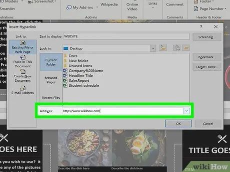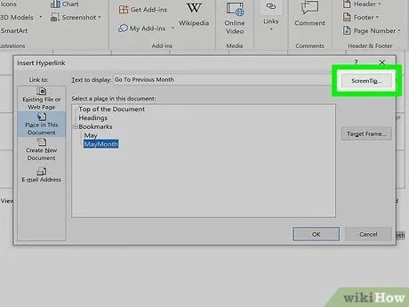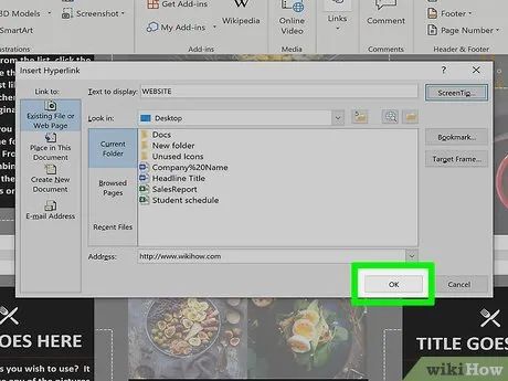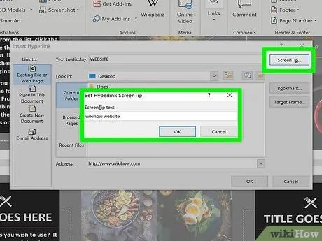 Set up a ScreenTip (optional). You can customize the text that appears when users hover over the link by clicking the ScreenTip button in the top-right corner and entering new text. If no changes are made, the default display will show the web address or file path.
