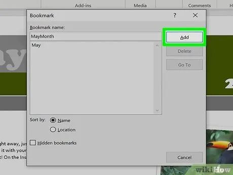 Click Add to insert the bookmark. Bookmarks will appear in brackets. In newer versions of Word, bookmarks are not visible on the page, but in older versions, they are displayed within brackets.