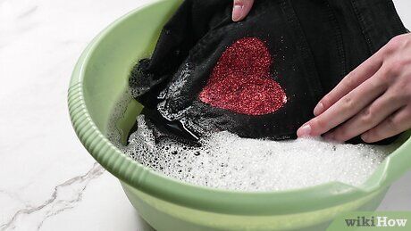 Wash gently. If possible, hand-wash the garment for better control. Fabric glue is synthetic and won’t wash off, but hairspray might. Generally, hand-washing helps protect the glue, glitter, and fabric more effectively. Be cautious—avoid vigorous scrubbing and machine washing.