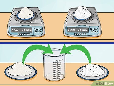Weigh the Powder. You will need 70 grams (2.5 ounces) of KNO3 and 30 grams of sugar. Once you've weighed the powders, pour them into a beaker and mix them thoroughly.