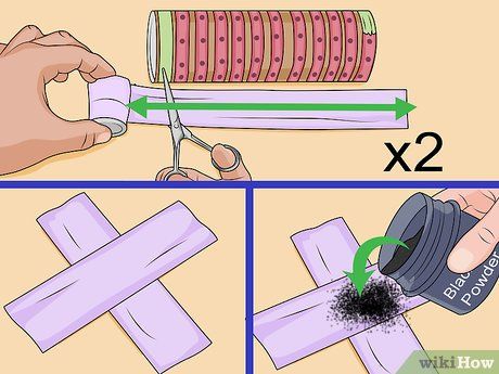 Prepare black powder. Cut two pieces of tape, slightly longer than the KNO3 block. Place one piece of tape over the other, forming a cross shape. Ensure the sticky side faces up. Now, sprinkle black powder over the cross-shaped tape.