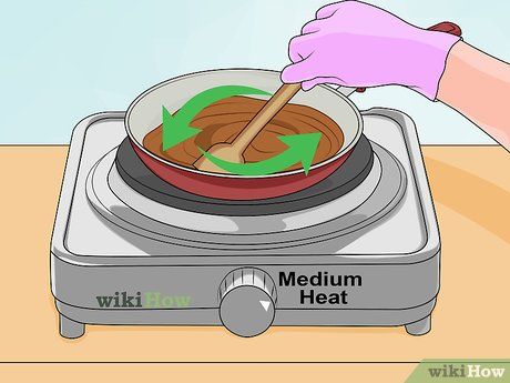 Heat the Mixture. Heat the mixture on a low-medium setting. Be sure to wear gloves and stir constantly to prevent the compound from burning. Continue heating and stirring until the mixture becomes liquid and turns a golden brown color.