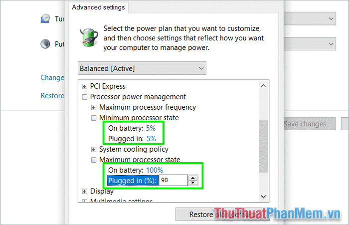 - Maximum processor state: The highest performance level of the CPU when in On battery mode (while using battery), Plugged in mode (while plugged into charger)