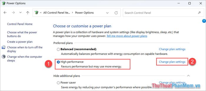 Step 3: Next, choose the High Performance (1) option and select Change plan settings (2) to configure the computer's minimum performance settings.