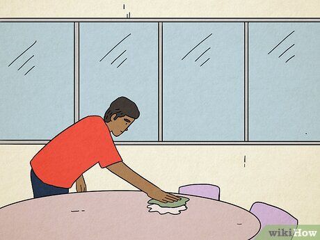 Wipe down the lunch table before leaving. Don’t leave behind milk cartons, crumpled napkins, or food crumbs on the table. Push in your chair neatly when you leave, and check the floor to ensure you didn’t drop anything.