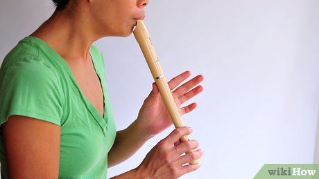 Practice blowing into the flute. Blow into the flute to familiarize yourself with the sound it produces. You should blow gently, imagining you're blowing a bubble. A soft, even breath is one of the most challenging but important techniques when learning to play the vertical flute.