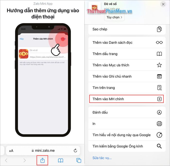 Step 2: Zalo will automatically open in your web browser. From there, select Share and then choose Add to Home Screen to place the Zalo lottery ticket shortcut icon on your home screen.