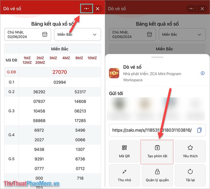 Step 1: In the Zalo lottery checking tool, tap the Options ➨ Create Shortcut icon to add the lottery check shortcut to your home screen.
