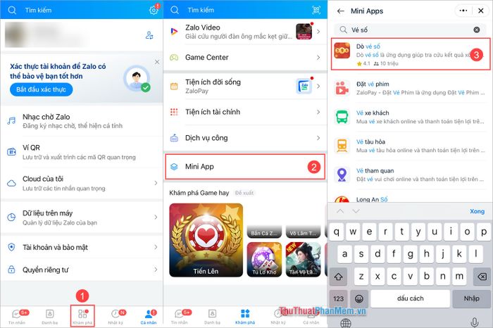 Bước 1: Bạn mở ứng dụng Zalo, chọn mục Khám phá (1) ➨ Mini App (2) ➨ Nhập Vé số và mở tính năng Dò vé số (3).