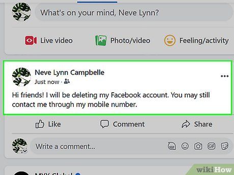 Inform Your Friends About Your Facebook Departure. Post a status to let your friends know that you are about to delete your Facebook account. This step will give them time to exchange contact details with you (if necessary).