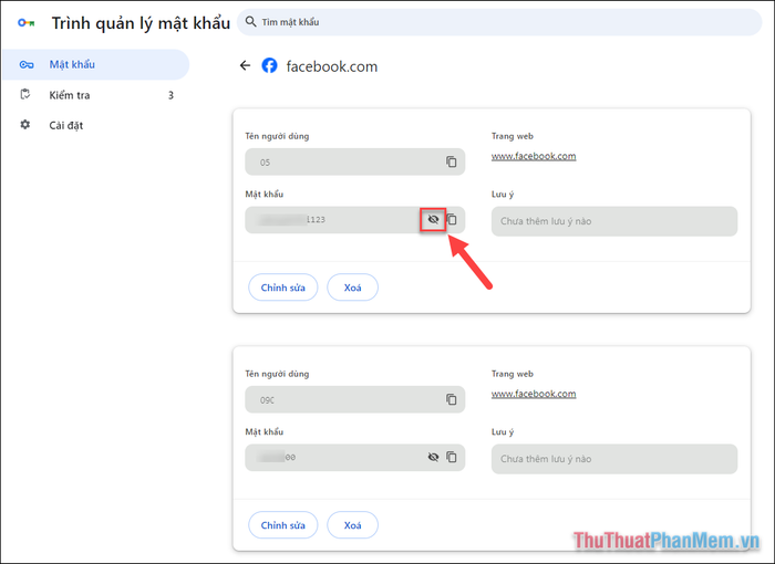 Step 3: In the list of websites with saved passwords, locate Facebook to view all stored passwords. Each account with a saved password on the browser will be displayed in the list. Check which account corresponds to the correct login details (Old phone number/ Email).
