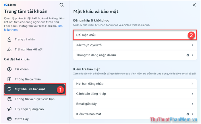 Step 4: In the Meta Account Center, click on the Password & Security (1) tab and choose Change Password (2) to set a new login password for your Facebook account, especially if you’ve lost access to your phone number or email address.